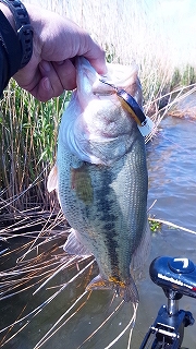 「水深1.2mで、ヒシモが50センチくらい伸びてきているツラを泳がせるイメージでドン!!ときました。45センチの重たい子でした。」 |