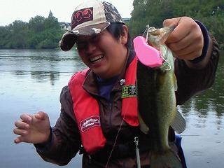 「不人気カラーのゲイリーピンク(笑)で早速、小さいですけれど決めました♪減水気味だったので岸、ブッシュより少しはなれたところで♪効きますよ、ピンクは!」