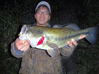 「H.Sの1投目にいきなり出た48cmのバスの写真を送らせて頂きます。 キングマーマー(Wフック)が口の中にスッポリ!!! 本当に記憶に残る良い釣りが出来ました。」 |
