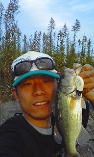 「何時もの家から歩いて3分の池に行き、様子を見ると何時もより水が清んでいて水深1m以上見えているのですが、岸際には全く生命感がなかったので、少し沖の地形変化がある所にキングマーマーをキャストしただ巻きを開始。 しかし何も起こりません。 遠投して同じ事をしても何も起こりません。 なのでただ巻きから、ストップ&ゴーに変えました。 その一投目にコンと当たりが、フッキング&巻き取りを渾身の思いで行い、無事ランディング。 それがこの子でした。 大きさは35cmとアベレージサイズでしたが、この時期のバスは貴重なので最高に嬉しかったです。」 |