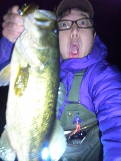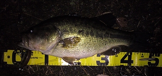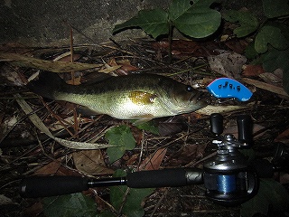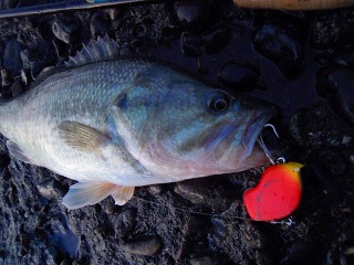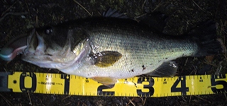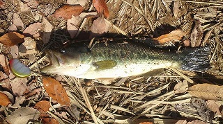 「12月に入り、もう今年の釣りも終わりかなと思ってましたが、チョッと暖かい雨が降ったので野池に行ってきました。でも着いたとたんに雨が止み、太陽が出て、風が北寄りに変わりました。 暗くなる寸前までなにもなく、切り札のキングマーマーに変えて数投で35。ブッシュの下を巻きながら軽くトゥイッチしたら喰いました。それから数分後、エントリー場所のコンクリートとウィードのあいだでただ巻き中に38。どちらもヒレピンのきれいなバスでした。」 |