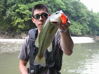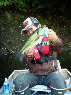 「前日の雨で一気に1m近く増水、当日は曇りのち快晴という微妙なコンディションでした。 バックウォーターに入って釣り始めると同船者がスピナーベイトで50センチを釣り上げましい、もう厳しいかなと思いつつマーマーdsoを投げるとなんと3連続バイト!全て40センチ絡みのきれいな魚でした」