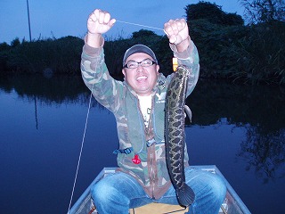 「今週はキングマーマーで雷魚、水面ヒラヒラアクションでナイスバイトでした。」