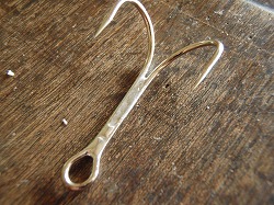 写真のようにフックのベンドしている部分を両側ともペンチで掴み、少しずつ外側に広げて下さい。
